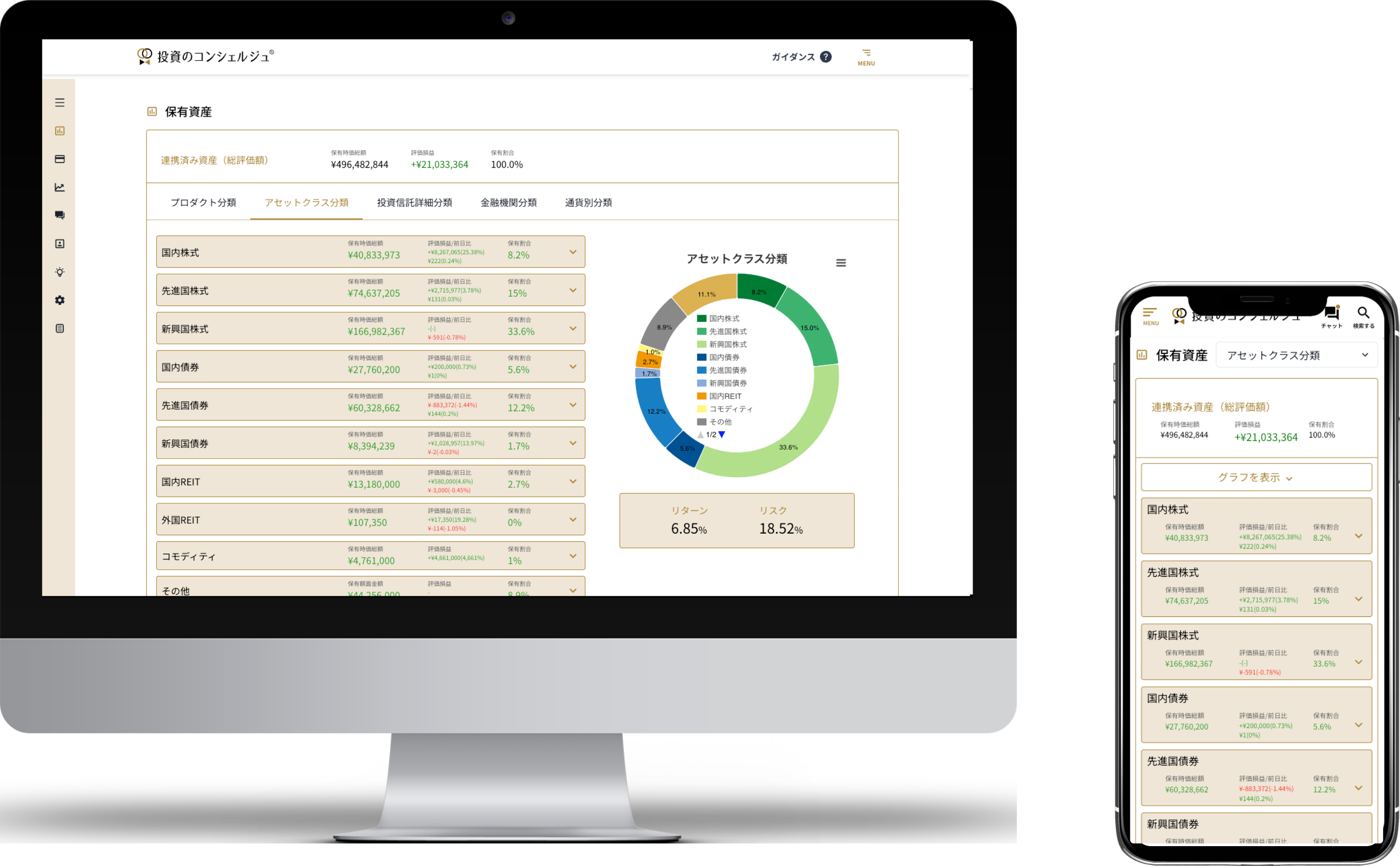 複数の金融機関に跨った資産を不動産や保険、現物資産なども含めて一元管理することができます。ポートフォリオをアセットクラス毎に毎日自動分類し、リスク・リターンを計算します。